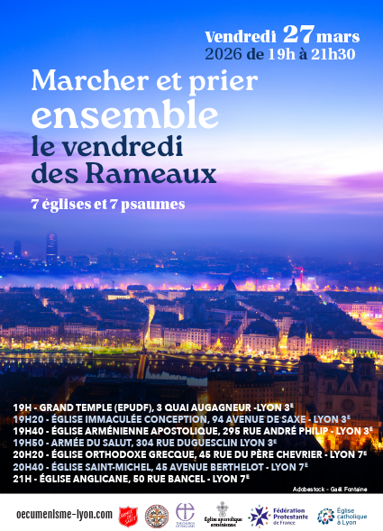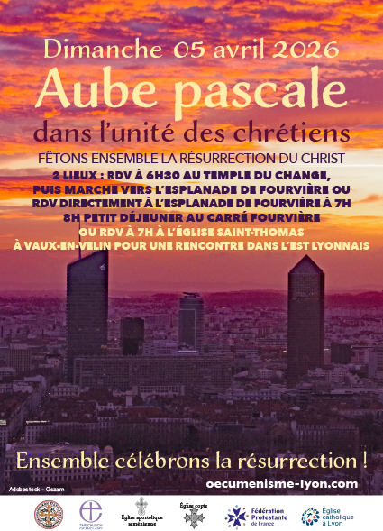 Dimanche 5 avril à l’esplanade de Fourvière (départ 06h30 du Temple du Change, ou RDV 07h00 à l’Esplanade), ou à l’église St Thomas de Vaux en Velin à 07h00 .